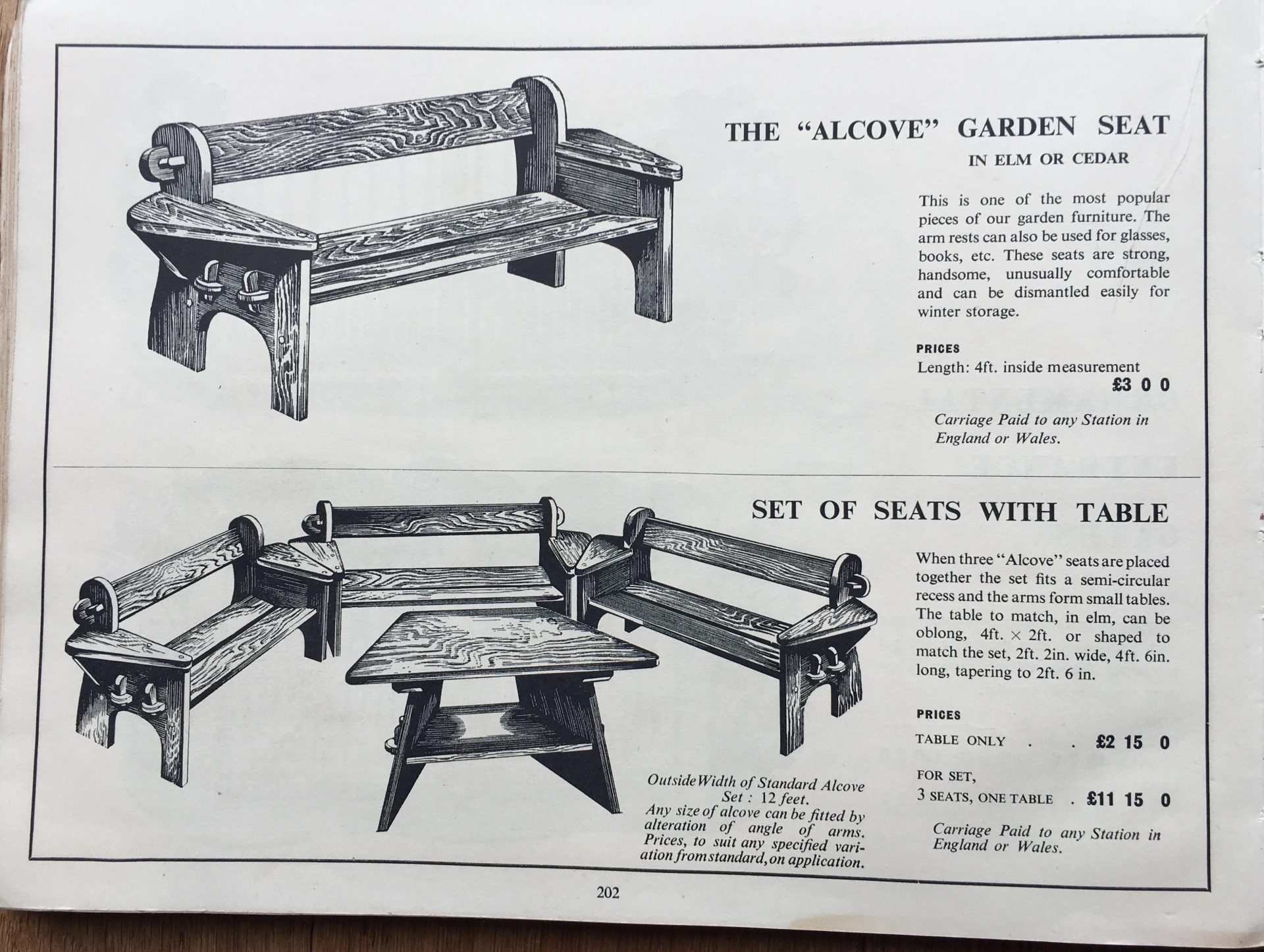 The Alcove Garden Seat was so called because when three of the seats were placed together, the set fitted a semi-circular recess with the arms forming small tables. As well as being placed around the estate gardens, it was advertised in the Garden Catalogue as “one of the most popular pieces of our garden furniture. The arm rests can also be used for glasses, books etc. These seats are strong, handsome, unusually comfortable, and can be easily dismantled for winter storage.”